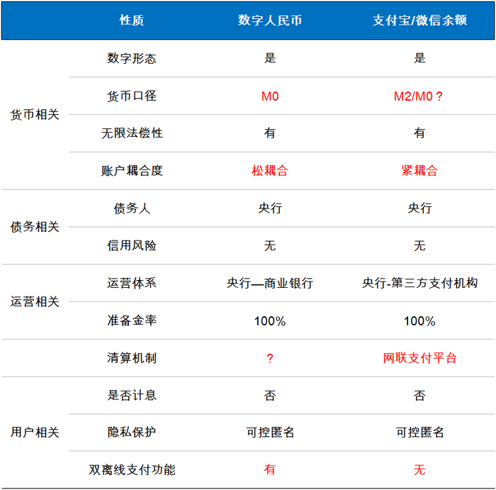 支付宝/微信等第三方余额的货币口径划分目前存在一定的争议。一般而言,业界普遍将余额宝和微信里的资金划归M2的范畴,因为认为它们是非存款类金融机构存款。然而自2019年央行下发通知,要求支付宝等第三方支付需要向央行缴存100%备付金缴后,支付宝/微信中的余额就相当于央行的负债(这与DCEP的100%准备金一样),非常接近央行数字货币的范畴,双方在债务人、信用风险、运营体系等方面非常类似,因此如IMF的Tobias Adrian等经济学家,就将支付宝/微信等第三方余额归为M0。