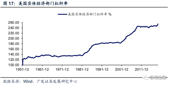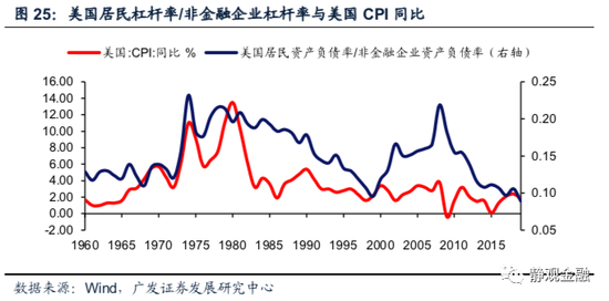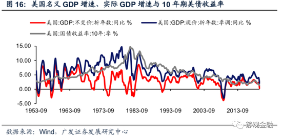 80年代以来美货币政策整体宽松推动实体部门杠杆率大幅攀升。由10年期美债收益率与美国经济增长相对位置的变化评估,过去40年间美国货币政策整体仍偏向宽松。80年代到90年代中期10年期美债收益率高于美国名义GDP同比增速;90年代末到金融危机前10年期美债收益率逐步降至美国名义GDP同比增速下方、但仍高于美国实际GDP同比增速;金融危机后的十年间10年期美债收益率与美国实际GDP同比增速中枢基本持平。80年代以来货币政策整体宽松的同时美国实体经济部门杠杆率中枢不断上升,但通胀中枢仍波动式下滑。