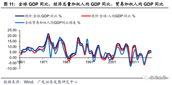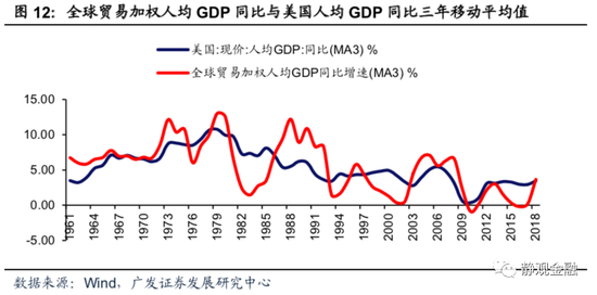 此外,如图11所示以经济总量加权得到的人均GDP同比增速与全球GDP同比增速高度相关,但以贸易加权得到的全球人均GDP同比增速与全球GDP同比增速则经常背离,我们认为这种背离或与产业转移有关。并且,在全球贸易加权人均GDP增速显著低于美国人均GDP增速的年份(年代),美国菲利普斯曲线就可能因为进口物价(输入型低通胀)的干扰而失效。