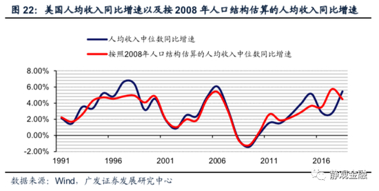 90年代以来美国人均收入中位数同比增速高点两度下移(1997年为6.7%、2006年为6.0%、2018年为5.5%),但以2008年美国人口结构与不同年龄段人均收入中位数估得的美国人均收入中位数同比增速高点却小幅上移(1998年为4.9%、2006年为5.4%、2017年为5.7%)。该数据进一步说明了金融危机后老龄化削弱了美国居民部门的消费力。而消费力的疲软是美国内生性通胀核心PCE同比中枢持续下移的主因之一。