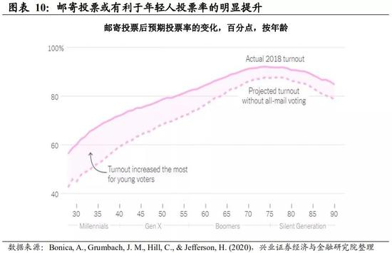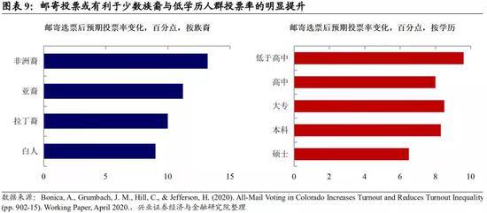 Bonica等(2020)的研究表明邮寄投票的放宽可能提升少数族裔、低学历、年轻人的投票率。Bonica等(2020)的研究表明,在科罗纳多2018年选举中,邮寄投票明显提高了投票率,尤其是少数族裔、低学历、年轻人的投票率。根据YouGov的民调数据,59%的拜登支持者计划邮寄投票,而仅有18%的特朗普支持者计划邮寄投票,此外,根据已公开邮寄投票情况的数据显示,大多数的邮寄投票选民中,民主党的支持率显著高于共和党。