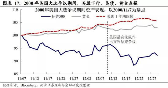 如果大选进入双方争议阶段,市场风险偏好将承压。此前特朗普宣称可能拒绝和平移交权力并提起上诉,这或是另一不确定性来源。如果大选进入双方争议阶段,参考2000年小布什与戈尔的大选争议情况,美国最高法院历时一个月才作出宣判结束争议,在此期间,美股下行,震荡加剧,美债、黄金走强。