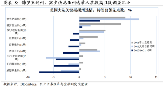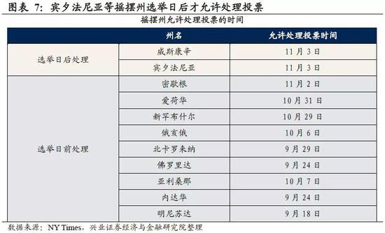 邮寄投票比例上升,可能使得大选结果晚于11月3日出炉。不同于往年的是,今年部分州允许邮寄投票迟到,并且要到选举日之后才能处理投票,其中包括宾夕法尼亚州等关键摇摆州。这意味着,如果在大选日,佛罗里达州等关键摇摆州的计票结果显示两人战局胶着,则必须要等待宾夕法尼亚州的计票结果,统计市场预计可能等待一周或以上。当然,大选结果不会无限期延长,按照美国法律规定,12月8日为确定各州选举结果的最后期限。