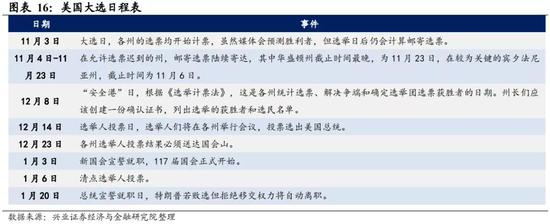 如果大选进入双方争议阶段,市场风险偏好将承压。此前特朗普多次声称对邮寄投票不满并宣称可能拒绝和平移交权力,这将是大选另一不确定性来源。如果大选进入双方争议阶段,最高法院将作出裁定,但12月8日前所有选举争议将结束裁定。参考2000年小布什与戈尔的大选争议情况,美国最高法院历时一个月才作出宣判结束争议,在此期间,美股下行,震荡加剧,美债、黄金走强。