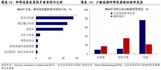 但Heidemanns(2020)的研究表明,少数族裔邮寄投票被拒绝率更高。需要注意到的是,相比于现场投票,邮寄投票对签名、到达时间和身份认证的要求,使得相当部分邮寄选票最终无效。在2020年美国总统大选初选中,有超过55万张投票因为迟到、邮戳错误或没有签名而被取消资格,占总投票比例约2%。Heidemanns(2020)的研究表明,少数族裔的投票因为填写规范等原因,更容易被拒绝,2016年美国大选中,非洲裔、西班牙裔的邮寄投票被拒绝率显著高于其它族裔,而考虑到这部分群体多为民主党支持者,这可能对共和党更加有利。因此综合来说,邮寄选票并未有偏好性。