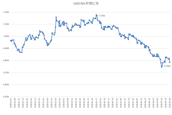 2020年1-9月美元兑离岸人民币即期汇率走势图(数据来自Wind)