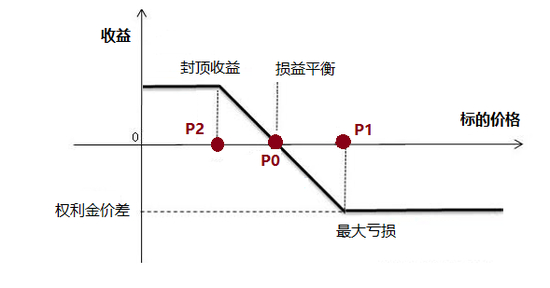 当期权到期,标的价格上涨到P0时,期权组合的净收益恰好与权利金净支出相等。我们把这个价格称为整个价差策略组合的损益平衡点。