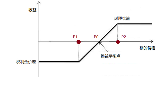 P1 为买入看涨期权的标的价格,P0为损益平衡点的价格,P2为卖出看涨期权的标的价格。