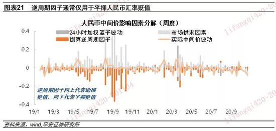 另需指出的是,从我们跟踪逆周期因子的使用情况来看,逆周期因子基本上都是对人民币贬值进行调节。譬如2019年5月到10月,市场供求因素推动人民币汇率大幅贬值,逆周期因子就发挥了很强的平抑贬值作用。而今年6月人民币开启升值以来,逆周期因子的作用就已逐渐淡出(图表21)。本次外汇交易中心公告称逆周期因子“淡出使用”,是否意味着永久淡出尚不得而知。但即便不再明确逆周期因子的存在,从人民币中间价报价行的报价,到最终发布的人民币汇率中间价之间,仍然存在政策上调整的空间。未来人民币汇率再面临较强贬值压力时,才是检验人民币汇率市场化决心的时候。