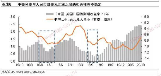 今年疫情冲击下,美联储施行零利率、推行实质上的赤字货币化,而中国人民银行保持正常货币政策操作,并率先推动货币政策正常化,导致中美利差攀升至历史极高水平。9月中美10年期国债收益率差值达到243bp,而2008年以来的月均最高值是204bp。中美利差构成本轮人民币升值周期的一种解释。但纵观2015年“811汇改”以来,二者仅在2016年8月至2017年3月、以及2018年8月至12月,表现出较为短暂的相关性。2019年5月到2020年6月,甚至表现为一定程度的反向相关(图表6)。