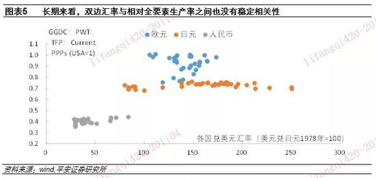 3)中国相对于美国的全要素生产率,反映长期经济增长的质量。1985年以来,中国相对于美国的全要素生产率(TFP)一直稳定在40%左右,在TFP层面无法解释人民币对美元汇率的变化趋势。加入日本和德国的历史数据后发现:从跨国比较来讲,相对TFP的水平可以从一定程度上解释双边汇率的水平,譬如德国与美国的TFP更加接近,欧元兑美元汇率也位于更高水平;日本次之,中国再次。但是,TFP无法解释一国汇率的历史波动,即便德国在1985年广场协议之后,相对美国TFP从0.7持续上升至2002年的1.0,其汇率也不是随之线性升值的(图表5)。