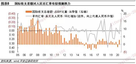 中国国际收支总差额(包含经常项目、资本项目、非储备性质的金融账户)对人民币汇率波动有较强解释力。2005年汇改扩大人民币汇率波动后,资本持续大规模流入中国,是2005年至2011年三季度人民币汇率趋势升值的核心原因。2011年四季度之后资本流入放缓,人民币汇率升值也随之缓和。2015年“811”汇改放开了人民币汇率的市场化定价,人民币贬值预期骤然增强,触发大规模资本外流,直到2016年底,国际收支才重回顺差。2018年中美贸易冲突后,由于经常项目顺差减少,国际收支顺差相应下降,人民币汇率也一度急剧贬值。总体而言,2015年8月之后,国际收支差额的变化与人民币汇率的波动呈现出稳定相关性(图表8)。