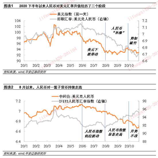 2020年6月以来,人民币对美元汇率走出了一轮趋势性升值。升值的过程(截至10月底)可划分为三个阶段(图表1、图表2):1)6月-7月,主要跟随美元走弱而升。这一阶段USDCNY从5月底的7.15跌至7月底的6.98,人民币对美元升值2.4%,人民币对一篮子货币汇率表现为低位波动。2)8月-9月,可理解为人民币对美元汇率“补涨”。这一阶段美元低位企稳,但前期人民币受制于中美博弈局势仍显紧张,对美元升值幅度较小。随着中美关系阶段缓和,USDCNY从7月底的6.98进一步升值至9月底的6.81,再升值2.4%。同时,人民币对一篮子货币汇率显著走高,CFETS人民币指数从7月底的91.4走高至94.4,升值3.3%。3)10月以来,人民币对美元升值超越了市场所理解的“补涨”范畴。这一阶段人民币对美元、对一篮子货币汇率均继续快速走高,而且是在央行10月12日将外汇风险准备金率从20%下调为0%,释放出关注人民币汇率持续升值信号的情况下;CFETS人民币指数从9月底的94.4进一步上行至10月22日的95.6,逼近今年3月23日美元骤升时形成的高点,以及2018下半年中美贸易冲突以来的高位。市场开始从人民币汇率升值对中国经济的冲击,以及央行所能容忍的升值上限的角度,对人民币汇率走势提出诸多猜想与讨论。