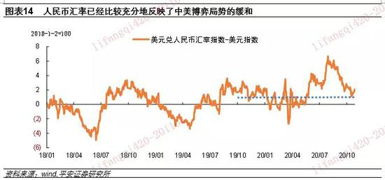 2018年6月15日,美方宣布对中国500亿美元出口商品加征25%关税,中美摩擦激化,自此以来,人民币汇率的重要拐点几乎都与中美博弈的演化相联系(图表13)。今年5月-7月,美方在华为问题、香港问题、新疆问题、抖音和微信禁令上,与中国再生龃龉,导致人民币持续偏弱,在美元大幅走弱的情况下,人民币汇率升值幅度也明显偏小。考察美元兑人民币汇率与美元指数的定基指数之差(能够较直观刻画二者波动幅度的差异),可以直观反映出中美博弈形势的转变(图表14)。今年8月以来,特朗普的关注点聚集在国内大选上,中美博弈局势开始缓和。8月25日,国务院副总理刘鹤应约与美国贸易代表莱特希泽、财政部长姆努钦通话,双方同意创造条件和氛围,继续推动中美第一阶段经贸协议落实,进一步缓和了市场预期,成为触发本轮人民币汇率升值走向深入的关键。目前,人民币汇率与美元定基指数之差已经回落到较低水平,人民币汇率已经较为充分地反映出中美博弈局势的缓和。