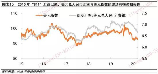 研究人民币汇率离不开对美元指数走势的判断,美元兑人民币汇率本身就是个相对概念,且美元是国际储备货币,其走势具有相对独立性。2015年“811”汇改之后,美元兑人民币汇率中间价除了挂钩前一日收盘价外(反映人民币与美元的市场供求),还需反映“对过去24小时一篮子货币汇率保持不变”(与美元指数的变化有很大关联),这使得美元兑人民币汇率定价的市场化程度、以及与美元指数的相关性大大增强(图表15)。值得一提的是,2015年以来,美元指数表现为高位震荡,没有出现大级别的周期走势,也给人民币汇率的稳定运行提供了良好条件。如果未来美元走出大级别下跌,将改变人民币汇率的波动中枢。