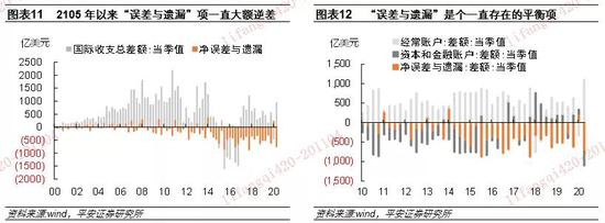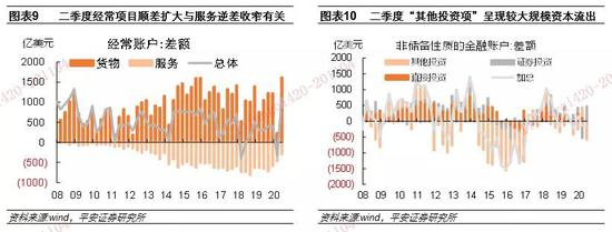 今年二季度中国国际收支顺差显著扩大,成为解释人民币汇率升值的重要依据,尤其是背后所反映的货物贸易顺差创多年新高、证券投资项下资本流入扩大。但以下两个结构问题需要注意:1)经常账户顺差扩大也在很大程度上得益于服务贸易逆差显著收窄(图表9)。2019年中国服务贸易逆差中83%是旅行项目逆差。可见,海外疫情导致出国旅行骤降,助推了国际收支顺差扩大。2)非储备性质的金融账户中,“其他投资”项下出现了大额逆差,“误差与遗漏”项也呈现大额净流出。这两项曾被认为与资本外逃相联系,导致不少观点认为中国资本外流压力依然不容小觑(图表10)。