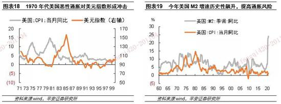 结合经济增速、避险情绪、恶性通胀三个角度基本可以解释美元指数的中短期波动:1)经济。如果美国大选以拜登当选并同时掌控两院而告终,则有较大可能通过新一轮财政刺激方案,在短期维度推动美国经济增长,对应美元走强。事实上,无论拜登还是特朗普当选,只要能够横扫两院,都会带来财政刺激和美元走强的效果。但拜登主张对富人、资本和企业加税,对外政策主张相对温和,这些可能令美元在中长期维度趋弱。2)避险。如果美国大选之后出现争议、无法顺利交接的情况,则可能导致避险情绪上升,美元阶段性走强。另外,如果出现全球金融危机(海外第三波疫情、全球高债务、货币大放水的情况下,这一情景的概率并不算低),也可能引发美元走强。3)通胀。如果美联储进一步扩大货币宽松,实行财政赤字货币化,则会大大推升通胀走高的可能性(虽然全球低通胀仍是经济和政策界的一个未解之谜)。今年美国M2同比从2月份的6.8%飙升至9月的24.1%,极大地打压了美元(图表19)。