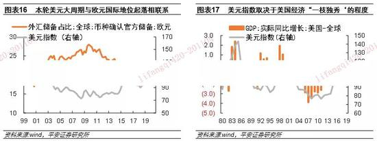 先看前一因素:新世纪以来美元指数的大周期,与欧元问世后国际影响力的起落高度相关:2000-2009年欧元在全球官方储备中的占比从18%上升到28%,2010-2015年受欧债危机影响又下降回19%,此后低位徘徊(图表16)。欧元目前最大的问题是,欧元区各国在放弃了货币政策独立性的同时,却始终没有形成统一的财政联盟。这导致意大利、西班牙等相对弱国,既无法通过贬值货币提振经济,又不能享受到德国等相对强国在财政上的扶持,区域内经济发展失衡、乏力,进而影响到欧元的国际货币地位。今年美元指数的大幅走弱,与欧盟通过了7500亿欧元共同债券方案密切相关。这标志着欧元区在统一财政联盟上迈出了历史性的一步,提高了市场对欧元国际储备货币地位的信心。但欧元币值迅速重估之后,欧元区是否能够继续朝统一财政联盟迈进,唯一财政状况较好的德国是否能够通过一体化财政刺激方案?还有待观察。截至目前,还看不到对美元国际地位形成挑战的币种,数字货币的推出可能成为一个破局因素,但还需要一个过程。
