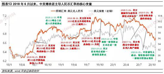 2、目前,人民币汇率已经较为充分地反映出中美博弈局势的缓和。目前,中美互加关税的规模和税率仍然维持在中美第一阶段经贸协议所达成的水平上,且相比去年底、今年初时,中美还相互推出了对实体和个人的制裁措施。如果我们假设当前中美关系回到了去年底、今年初时的状态,同时假设美元指数在当前水平上横盘震荡(93附近),那么对应美元兑人民币汇率应在6.64附近,也就是当前人民币汇率的波动水平。