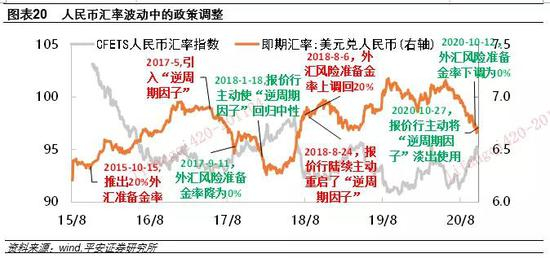 “下调外汇风险准备金率+逆周期因子回归中性”的政策组合,在2017年6月到2018年4月人民币上一轮大幅升值期间,也曾先后推出。不妨做一回顾:2017年5月,人民币汇率在美元趋势走弱的情况下仍一直在6.86一线横盘震荡,表现出很强的贬值预期。因而,央行引入“逆周期因子”,希望减少“羊群效应”,使人民币能够跟随美元走弱而适当升值。随后到2017年9月初,人民币汇率三个月时间内约升值了5.8%。于是,2017年9月11日,央行将外汇风险准备金率从20%下调为0%,使得人民币汇率V型反转,贬值约3.3%。但2017年12月开始随着美元新一波下跌,人民币汇率再度快速升值。2018年1月18日,外汇交易中心公告称,报价行已主动使“逆周期因子”回归中性。然而,这一表态并未遏止人民币汇率继续升值,到2018年2月7日,人民币汇率达到本轮升值最高点6.26,本轮升值累计幅度约为8.8%。注意到,央行释放政策信号的两个时点,都基本是人民币对一篮子货币汇率出现蹿升的时点。这说明政策层面确实关注汇率升值的潜在经济影响。这一点在本轮升值周期的应对上也是如此(图表20)。