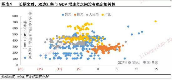 2)中国与美国的实际GDP增速差,反映经济增长的相对快慢。人民币兑美元汇率保持在一个较窄区间波动,并未随中美经济增速差的变化而呈现系统性变化。我们还考察了历史上韩元、日元、印度卢比三个亚洲经济体货币,发现也无法在GDP增速差的层面对汇率决定做出稳定解释(图表4)。