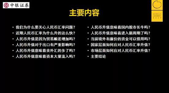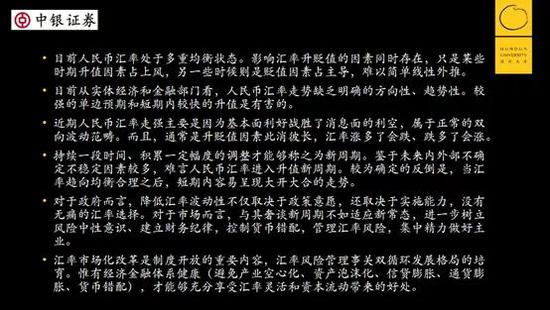 有人开玩笑说,在一个房间里如果有9个经济学家,对汇率问题可能有11种看法。实际上,汇率问题见仁见智,没有统一的答案。所以今天都是我个人的一些看法。