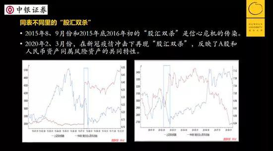 今年二三月份,由于新冠病毒在全球蔓延,美股10天内4次熔断,发生了全球股灾,我们也出现了股汇双杀,但这一次股汇双杀和那两次是不一样的。这次是因为疫情影响带来的不确定性,股票是风险资产,人民币资产对外国投资者来讲,总体上也属于风险资产。这导致了两个同属性的资产同方向调整。