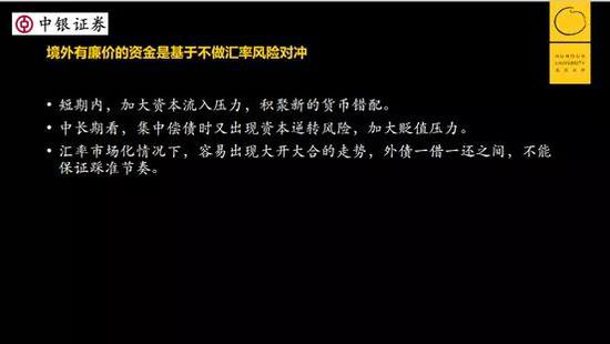 廉价资金只有什么情况?只有境内汇率高、利率高时,你借了进来以后不做套保,拿着汇率敞口赌人民币未来不会贬值,最好升值。如果人民币升值,既赚利差又赚汇差。但这是有风险的,我们不能保证外债一借一还之间能踩准节奏,在编制时候借、升值时候还。如果还款时正好碰上人民币贬值,就很可能把利差都亏掉。
