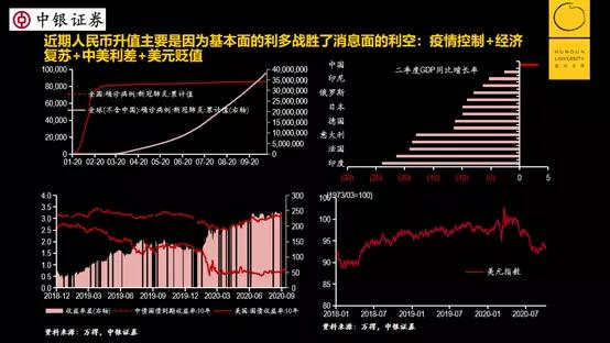 为什么会升值?实际上升值的原因,就是我们前面讲到的,疫情得到有效控制,经济率先复苏。然后中美利差比较大,现在中美十年期国债收益率才大概在240多个基点。还有就是美元指数走落,美元在国际市场上贬值,那么在境内人民币兑美元就是升值的。