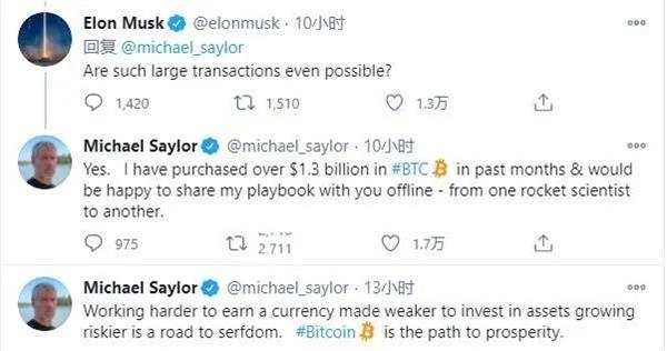 随后马斯克回复问道:‘这么大的交易有可能实现吗?’塞勒则回应称:‘是的,在过去几个月中,我已经购买了价值超13亿美元的比特币,我很愿意在线下与你分享我的经验。’