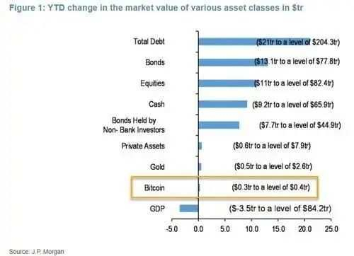 但绝对引人注目的是,尽管比特币产生了如此巨大的回报,但市值变化却相当小。如下图所示:债券市值今年以来增加了13.1万亿美元,股票市值增加了11万亿美元,而比特币却在市值仅增长3000亿美元的情况下创下了惊人的表现,升至27000美元的历史高点。相比之下,价格表现较比特币逊色得多的黄金,今年以来市值也增加了5000亿美元。