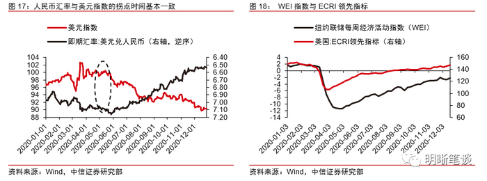 今年年中开始人民币汇率的走强更多还是对比美元的升值,明年下半年在基本面因素和美联储货币政策的影响下,美元指数可能会获得支撑。对于今年的人民币汇率走势而言,我们认为年中开始人民币汇率的走强更多还是对比美元的升值,5月底全球经济重启的乐观预期使得市场风险情绪有所好转,美元指数开始由强转弱进入到下行通道当中。而从年中至今美元指数下跌来看,一方面前期美联储快速扩表导致的美元下行压力仍然存在。另一方面美国先后经历了6月底和9月底两次疫情反复,而对比欧洲国家,虽然欧洲多国也在9月底遭受了疫情反复的冲击,但由于欧洲疫情防控措施相较美国更为有力,因此欧美疫情形势的对比也是当前美元指数下行的压力之一。从人民币汇率与美元指数之间的走势关系来看,年中人民币汇率与美元指数的拐点时间基本一致。虽然当前美元指数正处于持续走弱的过程当中,但我们认为明年下半年美元指数可能会获得支撑。做出这种判断主要出于两点原因,一方面当前美国经济正处于边际修复的进程当中,而从疫苗的研发进展来看,近期有关新冠疫苗的积极消息逐渐增多,因此明年随着美国经济逐渐复苏,美元或受到基本面因素的支撑。另一方面,美国新一轮财政刺激法案成功签订,短期来看美联储的货币政策仍将以宽松的基调为主。但对于稍远的时间,目前美国通胀预期上行的速度较快,考虑到后续美国经济复苏脚步加快叠加可能到来的通胀影响,美联储货币宽松的脚步或将出现放慢。结合以上两点原因,我们认为明年下半年在基本面因素和美联储货币政策的影响下,美元指数可能会获得支撑,因此人民币受到美元走弱带来的升值压力或也将有所减轻。