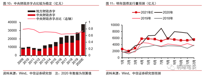 三、政府债券净融资缩量,预计发行高峰6~9月。财政政策逐步回归常态,预计赤字率和新增专项债额度均有所下调,政府债券净融资额约6.4万亿,较2020年政府债券净融资规模的8.5万亿减少约2.1万亿。国债、地方政府一般债回归往年发行节奏,新增专项债额度提前下达但发行节奏可能并不会如2020年般大幅提前。总体而言,预计2021年政府债券发行高峰集中在6~9月份。