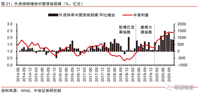 今年外资加速增持中国债券。2020年1~11月外资增持中国债券8854.9亿元,接近2019年全年外资增持中国债券规模4704亿元的两倍。一方面是2019年4月起逐步纳入中国国债和政策性银行债券的彭博巴克莱全球综合指数、2020年2月起逐步纳入高流动性中国政府债券的摩根大通全球新兴市场政府债券指数系列的被动增持;另一方面是2020年5月份以来,国内货币政策回归常态化,市场资金面收紧,驱动中国10年期国债收益率持续上行,而新冠疫情下美联储快速降息和无上限量化宽松的结果导致了美国债券利率一路下行,中美利差持续走阔,境外机构也正不断增持人民币债券,增持幅度创下新高。最后,中国出口高增、外资流入带来人民币汇率升值且升值预期较强,进一步吸引外资增持中国资产。