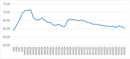 图2、美元储备占全球已分配外汇储备的比例(1995-2020Q3,%)
