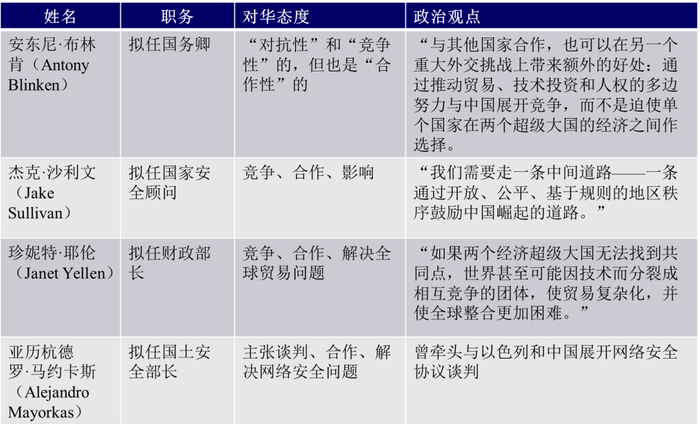 图4 美国新任总统拜登执政团队主要成员对华政策观点摘编