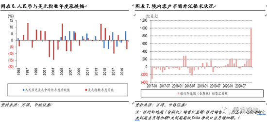 自1994年初汇率并轨,确立以市场供求为基础的、有管理的浮动汇率制度后,人民币汇率中间价有超27年的历史数据。但是,2015年前,人民币汇率总体单向升值,目前实施的参考篮子货币调节的汇率政策仅有5年之久(2016年至2020年)(见图表6)。鉴于这5年数据中,美元处于贬值趋势的仅有2017年和2020年,可借鉴的数据就更少了。同时,这两年美元指数下跌时,境内外汇供需状况和市场汇率预期也明显不同。