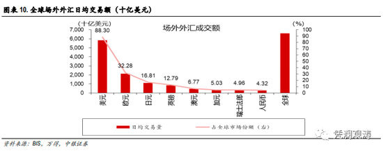 在有管理浮动框架下,人民币市场汇率走势更多遵循适应性预期,即市场以为人民币汇率一涨会永远涨上去、一跌永远会跌下去。但预测美指走势难度非常大,短期遵循随机游走过程。由于不仅美元本身是自由浮动的,而且美元指数对应的六大货币也均是自由浮动的汇率安排,所以美元市场化程度较高,价格发现机制更为有效。根据BIS统计,2019年日均外汇市场交易量排前七的是美元、欧元、日元、英镑、澳元、加元和瑞士法郎。排名第二至第七的为美元指数组成部分。其中,美元日均交易量达到5.82万亿美元,占总量88.3%(见图表10)。想要在如此庞大的市场中,通过准确预测来获得无风险收益的难度可想而知。