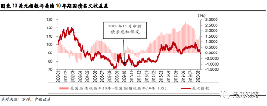 “双赤字恶化+宽松货币”的看空美元组合有一大假设,即美联储不会在经济超预期的状况下提前实施购债削减。但如果2021年下半年美国经济复苏超预期,市场可能会出现美联储货政退出的预期,进而可能推高美债收益率。近期,美元指数回升就是在10年期美债收益率突破1.1%的助推下实现。如果欧洲难以摆脱经济和通胀低迷(欧洲债券难以走出负收益),美德利差走高将为美元提供支撑(见图表13)。