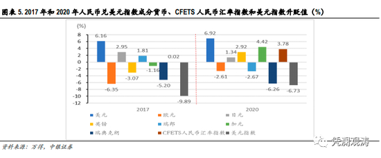 按照第二部分测算的美元兑人民币汇率变动相对于美元指数变动的弹性系数,如果2021年美指跌到80,相当于从2020年底的水平下跌约11%,对应着美元兑人民币下跌3%稍强,远小于美元兑人民币跌破6(即人民币兑美元汇率升破6)所需8%左右的跌幅。即便按照2017年美元指数贬值、人民币兑美元升值、人民币汇率指数基本稳定的情形,当年美指跌幅转化为美元兑人民币跌幅的比率约为59%。根据这一转化率,2021年,美指跌到80,美元兑人民币大概下跌6.50%,跌到(即人民币兑美元升到)6.10左右的水平。