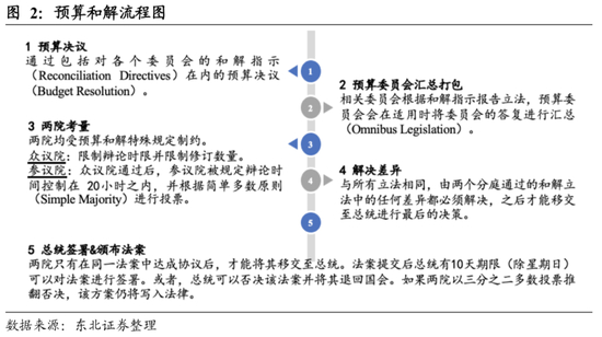预算和解(Budget Reconciliation)是一个可选的加速立法程序,是可以绕过参议院冗长辩论(Filibuster)的特殊程序,用于对拨款法案涉及项目与授权立法项目不一致之处的调整。此程序规定参议院在20小时之内完成讨论付诸表决并且以简单多数(Simple Majority)的形式(即51票通过制)进行投票。