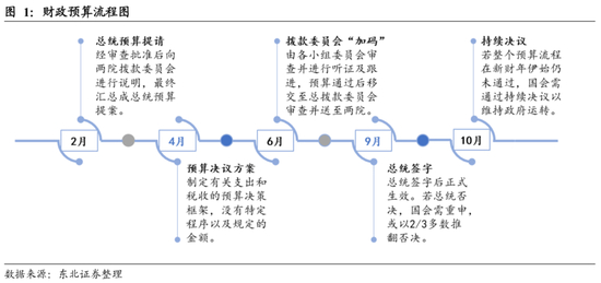 美国的财政年度是从每年的10月1日到次年的9月30日。联邦预算流程非常复杂,为了在新财年的开始颁布下一年预算最终文件,新财年的预算流程大致会于每年年初开始。
