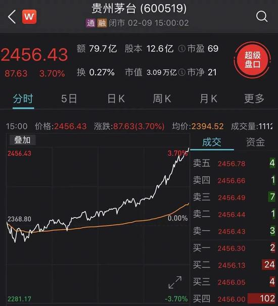 也是在同一天,贵州茅台又创了一项A股纪录,成为首家市值突破3万亿元的上市公司。贵州茅台收于2456.43元/股,市值3.09万亿元。