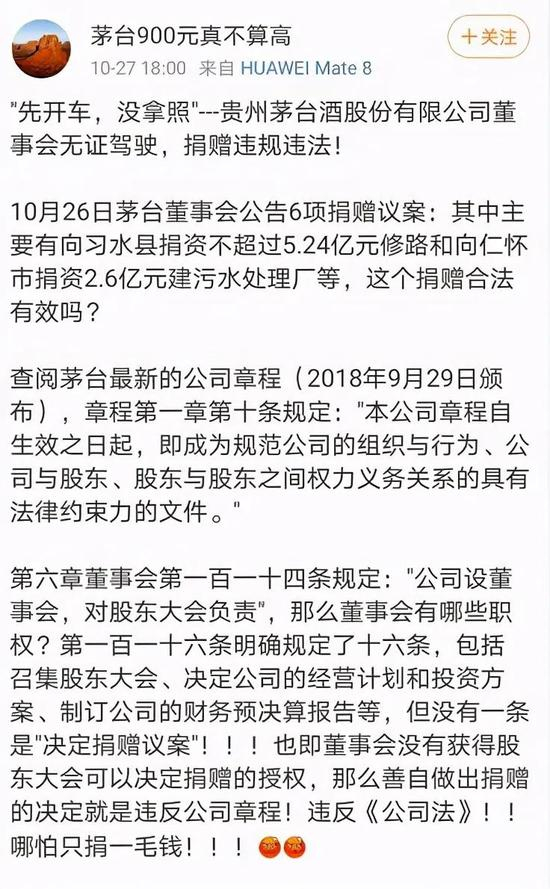 之前茅台没有经过股东会决议,私自公开宣布将向地方政府捐赠8个亿的资产,其中向习水县捐资不超过5.46亿修路,和向仁怀市捐资2.6亿建污水处理厂。虽然这些事是属于显示企业责任的事,在茅台看来明明是利国利民的好事,但却遭到一些小股东强烈质疑。