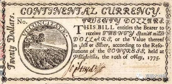 为了凑钱打英国佬,殖民地大陆会议(类似于新中国建国初期的政治协商会议)发行了大陆币。