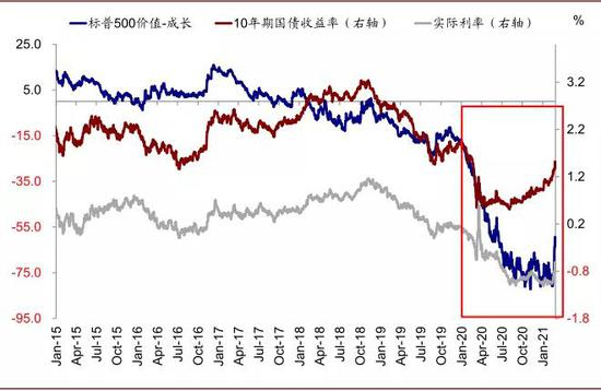 其次,对高估值部分的边际影响相对更大一些。实际利率抬升也意味着实际的融资成本走高,对企业融资或杠杆都是如此(尽管目前依然大幅为负,10年美债实际利率为-0.75%),因此对于高估值、拥挤交易部分的边际影响相比单纯通胀预期抬升时更大,这也是近期美股高估值的纳斯达克和成长风格承压而去年下半年整体平稳的原因之一。