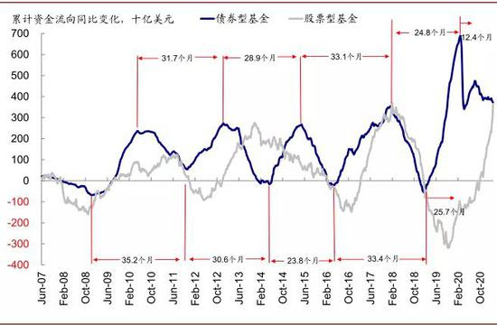 图表: 债券型基金及股票型基金累计资金流向同比变化