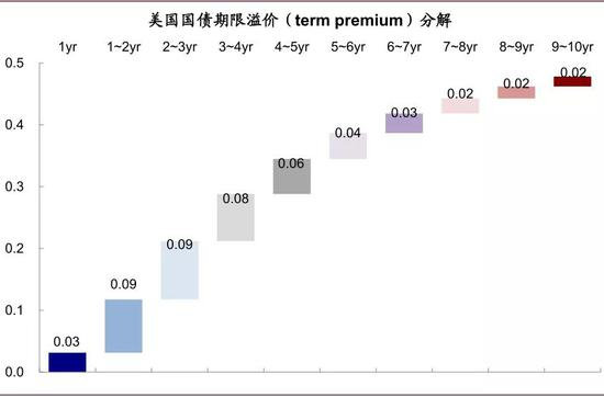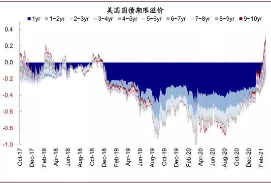 另一种拆解方法是期限溢价(term premium)和中性利率(risk neutralrate)。近期10年美债利率上行主要以期限溢价为主,也是其2018年以来首度转正,而且拆解不同期限后主要为2~3年期限,相反中性利率基本维持不变,这恰恰说明投资者预期未来更高的经济增长回报率进而导致期限溢价走高,而由于美联储在一段时间内仍将维持宽松,因此中性利率基本保持不变,这与上文中所反映的信息一致。