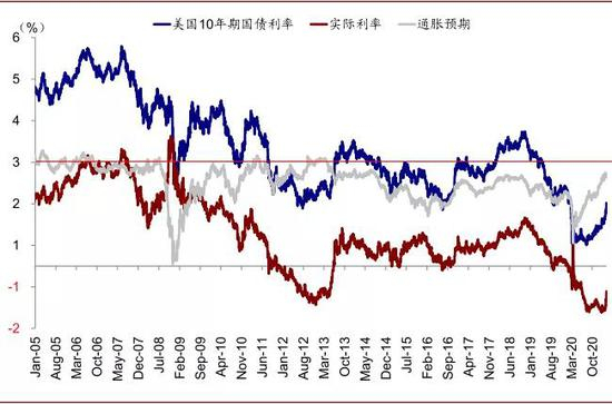 往前看,我们预计实际利率仍将是推动美债名义利率上行的主要因素,主要逻辑除了美国经济实际增速在新一轮刺激和疫苗接种加速推动下存在上行风险外,通胀预期也已经计入较多预期处于高位。