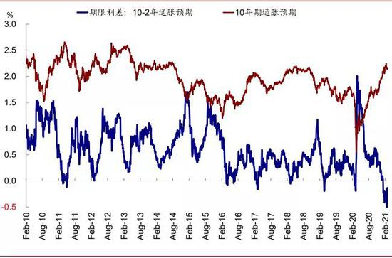 图表:从历史来看美债利率中隐含的长期通胀预期存在明显的“上沿”,目前已经达到2.2%